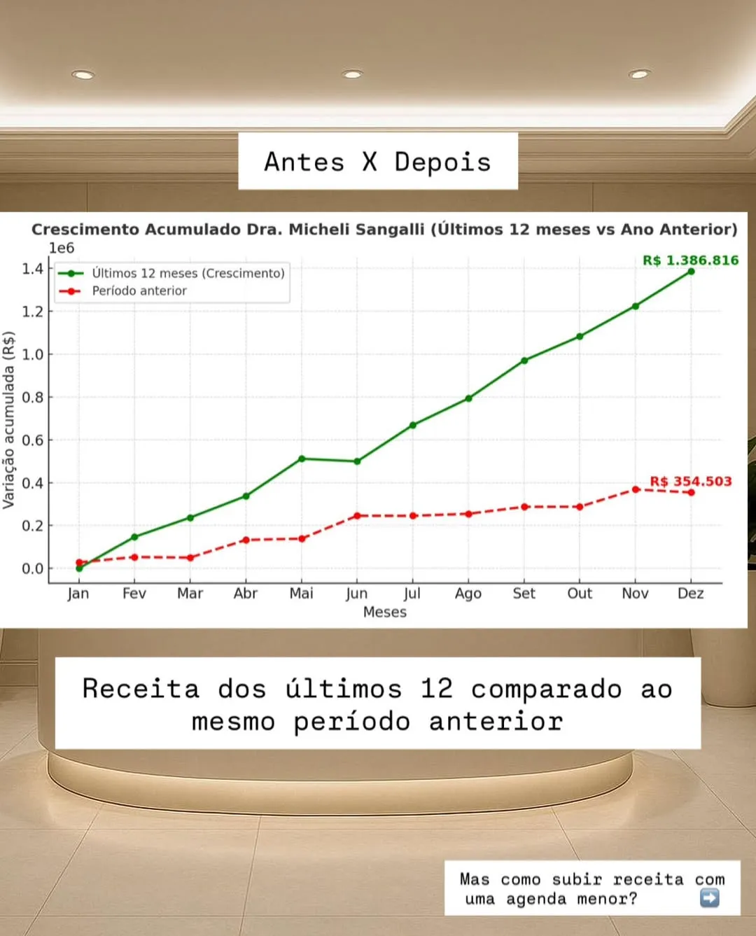 A Dra. Micheli Sangalli em apenas 12 meses, cresceu mais de R$ 1,3 milhão em faturamento, sem aumentar a agenda. O processo envolveu filtros de triagem, ancoragem de valor e um modelo de fechamento premium. Hoje, ela atrai apenas os casos certos, com alta percepção de valor e previsibilidade de receita.